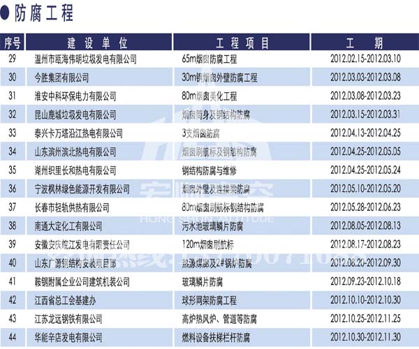 宏順建設工程有限公司是國家批準成立的專業(yè)高空作業(yè)企業(yè):承攬過(國內(nèi).國外)煙囪新建、煙囪防腐、磚煙囪新建、煙囪改造、煙囪維修、煙囪脫硫防腐、煙囪拆除加高、煙囪滑膜等高空作業(yè)工程。具有“不搭腳手架 、 不需要停產(chǎn)”施工特點。